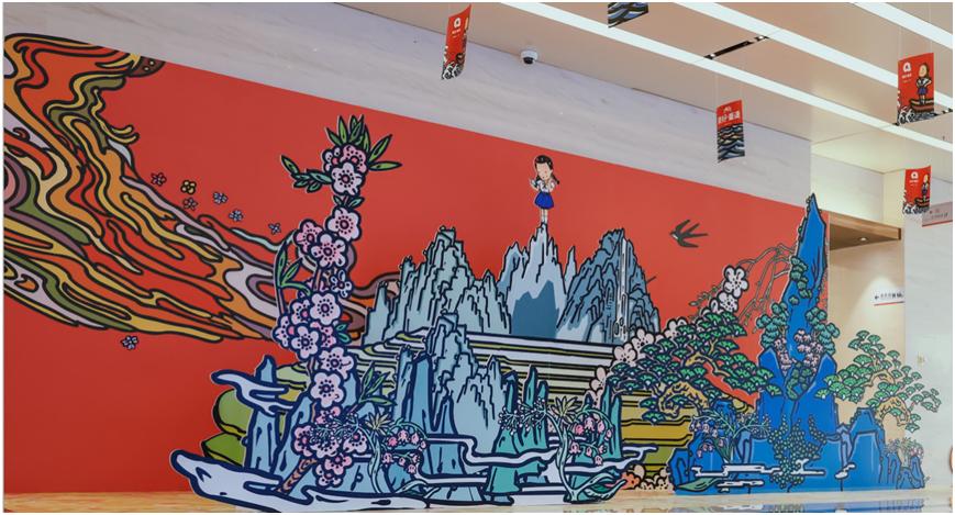 互動區(qū)——“送你一朵小紅花” “送你一朵小紅花”互動裝置打造了卜樺作品《春風(fēng)拂面》中太陽灑下溫暖光芒、祥云飄逸靈動、柳樹輕拂微風(fēng)、山峰屹立巍峨的自然仙境,構(gòu)建出極具沉浸感的互動場景。市民朋友可以在花朵貼紙上寫下對生活、對未來的美好愿望,并將其貼于背景墻上,用愛與期待編織希望的篇章。