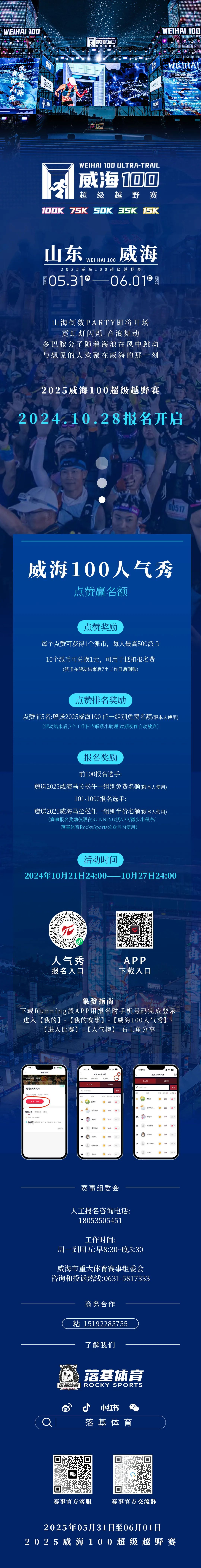 2025威海100超級越野賽由威海市重大體育賽事組委會主辦,威海市體育局、威海市體育總會承辦,煙臺落基體育有限公司具體負責(zé)賽事運營。賽事設(shè)100KM、75KM、50KM、30KM、15KM共5個競賽距離,將接受不超過3000人報名參賽。